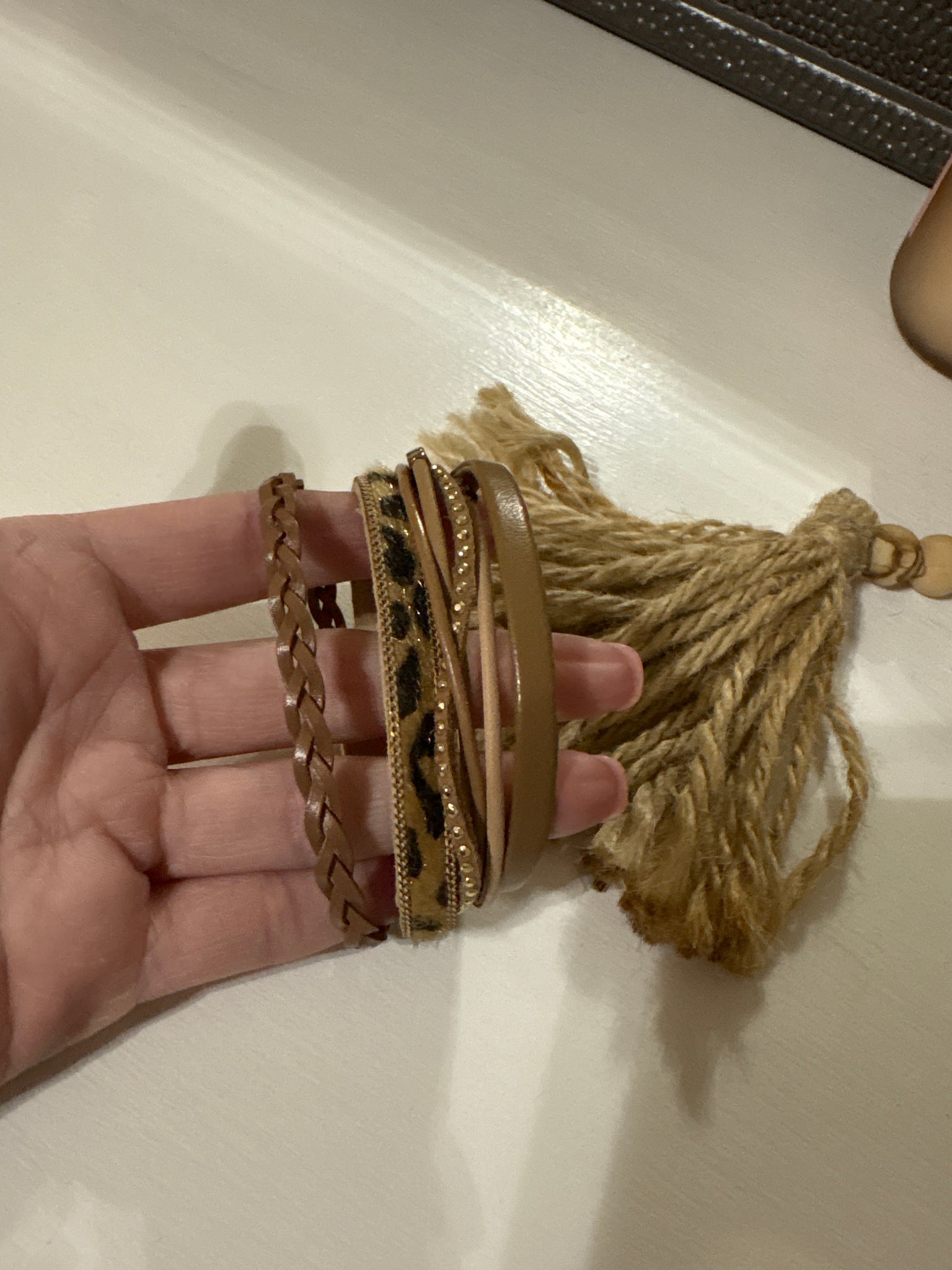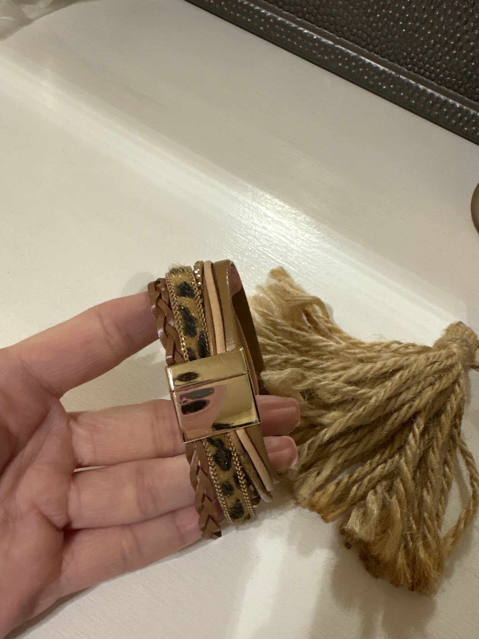 multilayer leather wrap bracelet with a leopard print section and a braided section, typically featuring a magnetic clasp